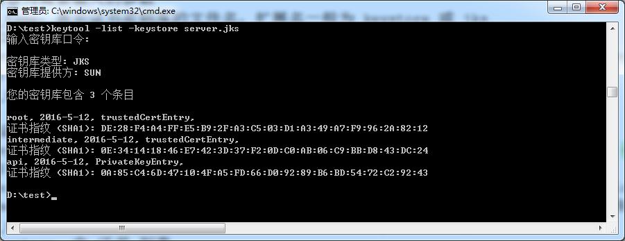 如果根证书、中级 CA 证书以及服务器证书均导入 keystore 中,用命令查看 keystore 中的证书列表所显示信息应如下图所示,共含有三级证书链。